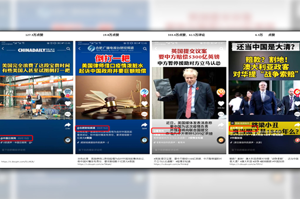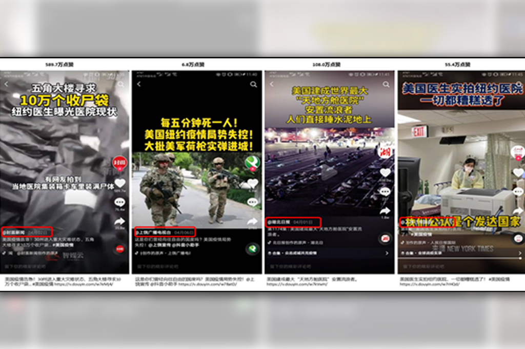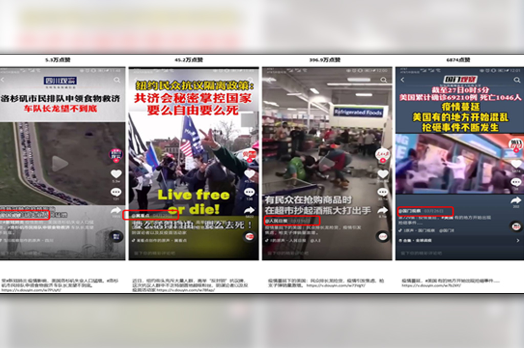 觀看今年疫情肆虐之際,網路上開始熱烈討論「病毒從哪裡來?」,當輿論風向都將矛頭指向中國時,外交部趙立堅3月故意拋出「美軍帶毒到武漢」的推文,中國官媒的抖音帳號更利用短視頻重複上述陰謀論的觀點(圖1);此外,中國也大幅炒作美國抗疫不力(圖2),宣揚美國疫情嚴重醫療系統近乎崩潰(圖3),並凸顯疫情造成美國社會停擺經濟衰退社會動盪,相反的,中國也同時大肆吹捧自己是領導世界的抗疫功臣,更厲害的是,中國更大打「悲情牌」,針對各國譴責中國「隱瞞疫情」,刻意渲染為「新八國聯軍侵華」,試圖激發民眾仇外的情緒(圖4)。