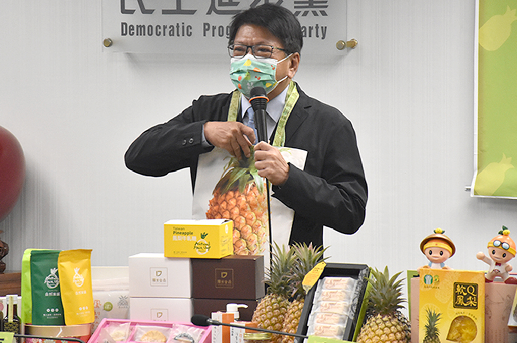 民進黨中央黨部今(3)日中常會前舉行「買鳳梨 挺農民」記者會,邀集台灣鳳梨產地的嘉義、台南、高雄、屏東等四縣市首長齊聚。四人賣力吆喝推銷鳳梨,表現獲得總統暨黨主席蔡英文的讚許。高雄市長陳其邁提議民進黨「黨徽的台灣改鳳梨」,引起一陣大笑。屏東縣長潘孟安把鳳梨圖案的帆布袋掛在脖子上,幽默表示,吃完鳳梨的渣渣,可以直接吐在裡面,頓時成為全場攝影機閃光燈的焦點。