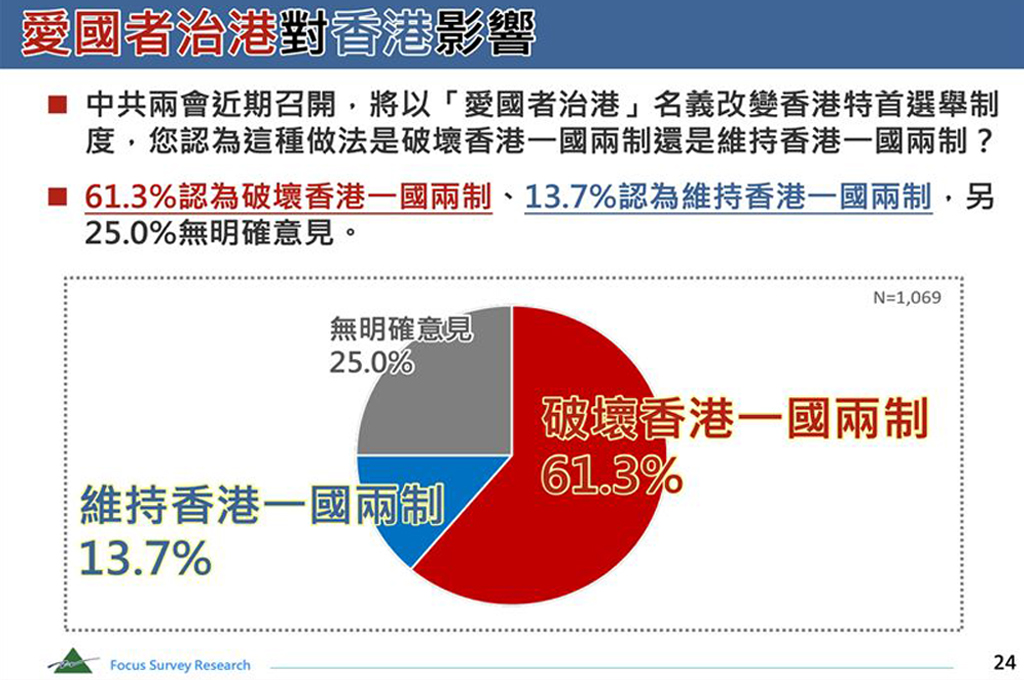 針對中共強以「愛國者治港」名義改變香港選舉制度,中華亞太菁英交流協會今(9)日公布「中共兩會與近期兩岸關係發展」民調顯示,有61.3%台灣民眾認為是破壞香港「一國兩制」,僅13.7%認為是維持香港「一國兩制」。