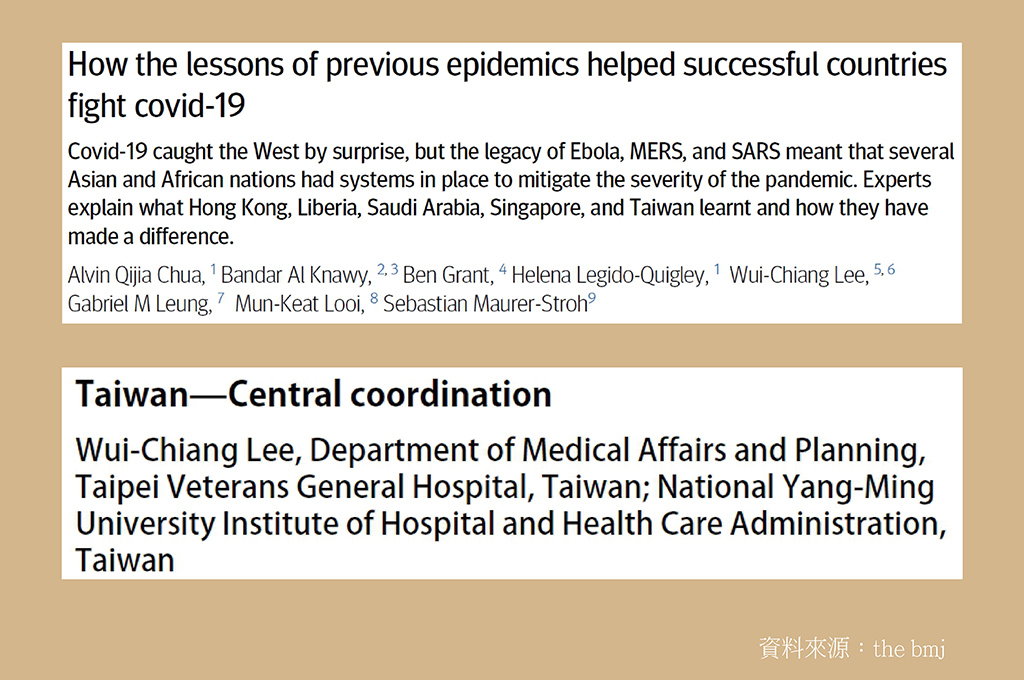 台灣防治武漢肺炎的過程登上英國醫學期刊BMJ。該文作者為台北榮總醫務企管部主任李偉強,他今(12)日出席指揮中心記者會說明,很多國家都羨慕我國有完善的指揮中心,內容也提到台灣因SARS經驗,政府開始強化防疫措施,建立資訊系統,各部會才能在疫情中做好跨部會協調,迅速應變,這是值得其他國家學習的台灣經驗。