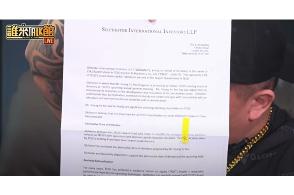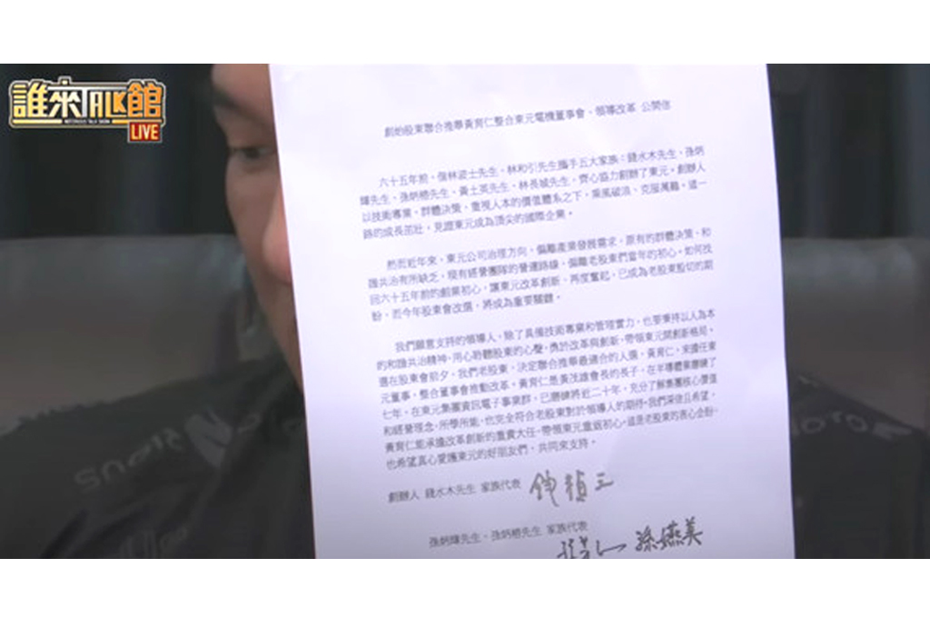 東元起初是由五大家族成立,無奈公司發展逐漸走向一言堂,加上現今董事會成員多為顧問,德高望重,其他人也不敢提出太多意見。因此黃育仁選擇脫黨參選,提出改革政策,目前也都獲得4大家族的支持。黃育仁對著鏡頭秀出其他4個家族的聲明稿,證明最初一起創業的4大家族都對他表示支持。另外,他還一併秀出最大外資股東Silchester的聲明稿,Silchester也認為公司必須改革。