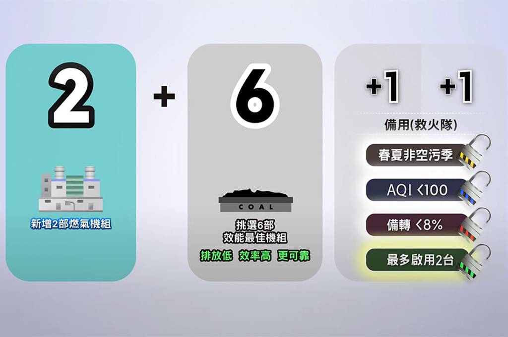 正因如此,中市府每多卡一年,中火減煤240萬噸的時間就多晚一年。很諷刺的,中市府為「確保」不增煤而卡新燃氣機組的代價,卻是「確保」減不了煤。4座燃煤機組「拆除」或「備用」,差異僅在運轉可能性為0%和3%之別,為了避免這3%的可能性,而無限上綱地卡中火燃氣,讓100%可以減少的每年240萬噸燃煤無法成真,真的對改善台中空品比較好嗎?
