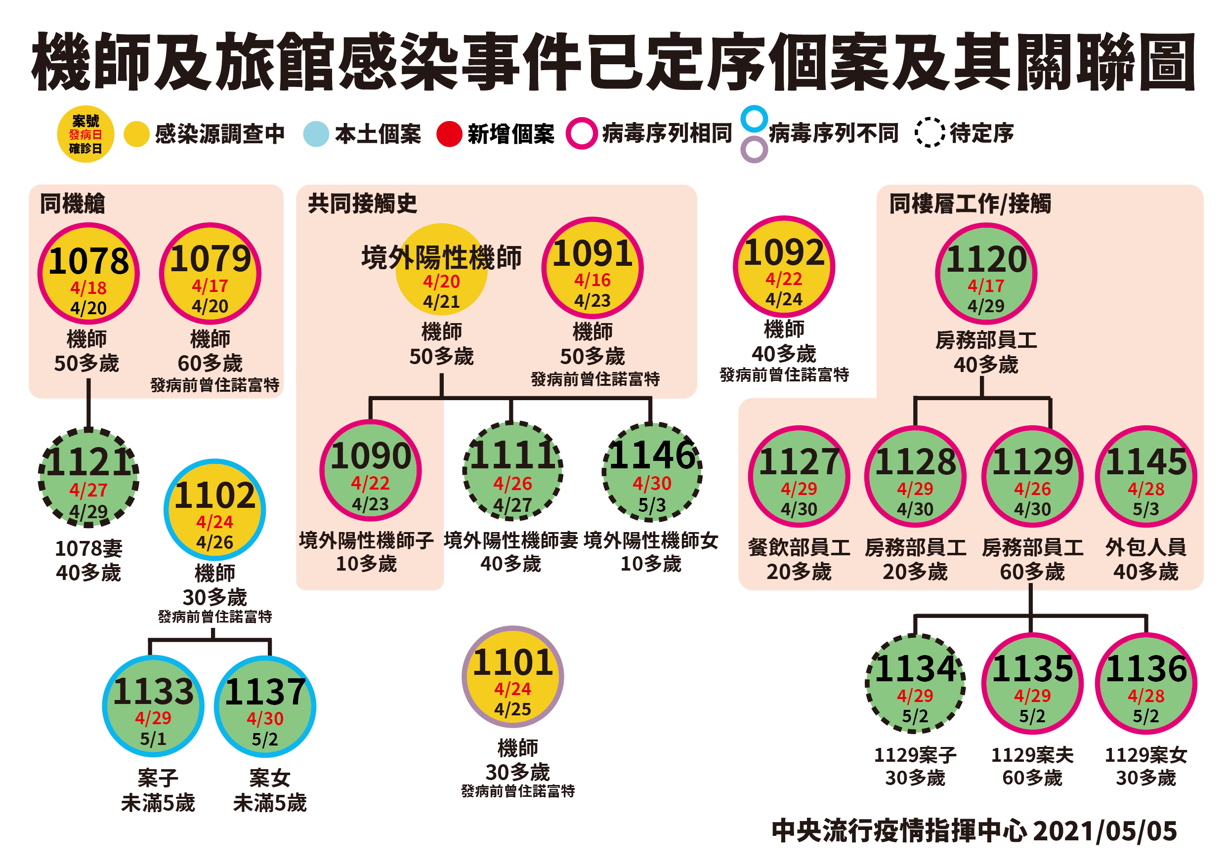 中央流行疫情指揮中心今(5)日在記者會上宣布,華航諾富特案染疫者新增8名完成病毒基因定序,皆為英國變異株。醫療應變組副組長羅一鈞說明,此事件已完成定序的16名病例皆為英國變異株,但其中4人病毒序列不相同;研判諾富特的群聚跟華航的群聚是一起的,案1102的家庭群聚可能是另一起案例。