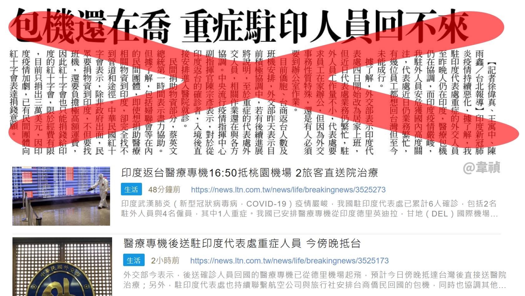 指揮中心記者會上說明,從印度返台者除了今天的44名,也已經安排醫療專機接送台灣駐印度代表處6名確診者,預計傍晚抵達台北後直送醫院。此舉等同打臉《聯合報》今日不實報導「包機還在喬 重症駐印人員回不來」。《聯合報》聲稱,我駐印度代表處重症的外交人員至昨晚人仍在印度,醫療包機仍在協調;代表處近日仍業務繁忙,有幾位員工都想回台灣但至今未能成行。