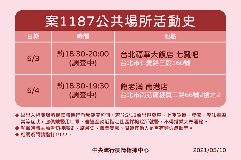 陳時中表示,由於案1187可傳染期間曾有公共場所活動史,提醒曾於所列時間及場所活動的民眾,進行14天自我健康監測,如有疑似症狀,請儘速戴口罩就醫,並主動告知醫師活動接觸史。