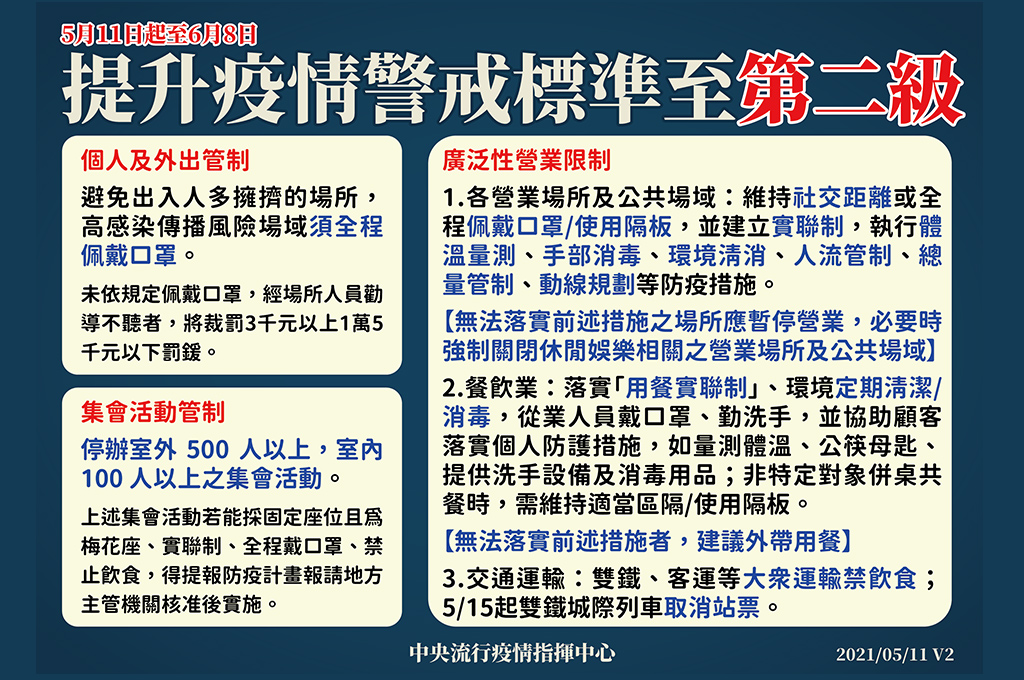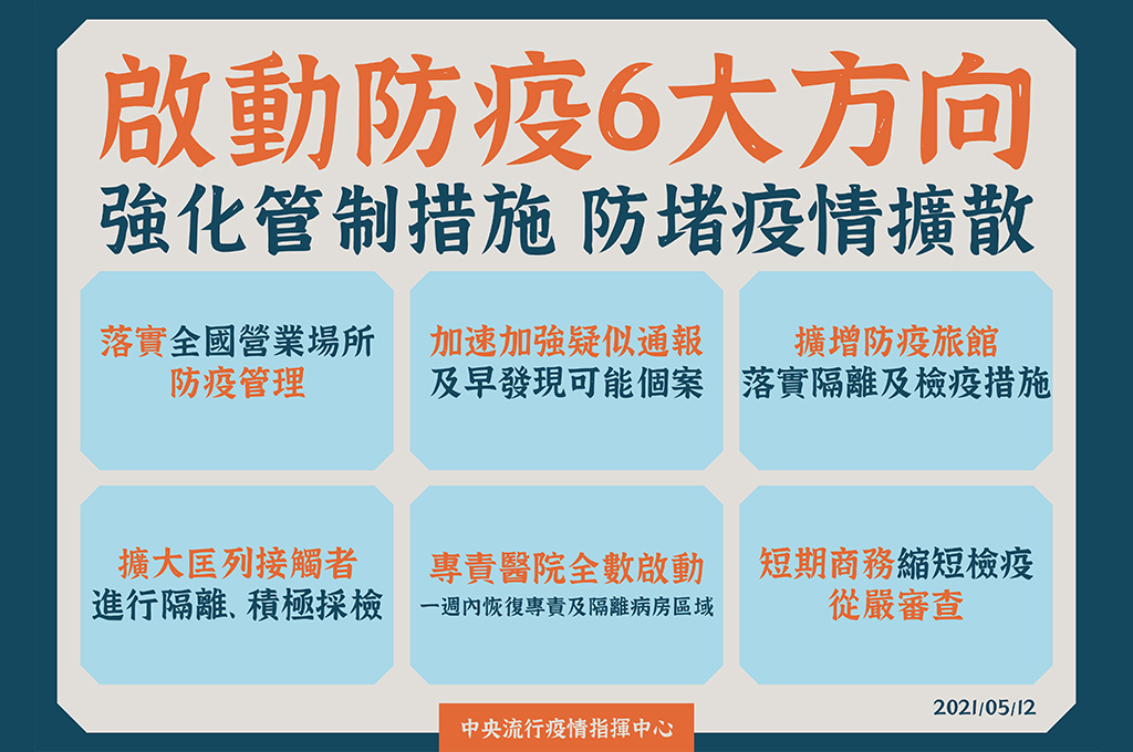 國內疫情態勢嚴峻,今(12)日再增16例本土個案,1例感染源不明。中央流行疫情指揮中心啟動「防疫六大方向」,指揮官陳時中指出,包括落實全國營業場所防疫管理;加速加強疑似通報及早發現可能個案;擴增防疫旅館、落實隔離及檢疫措施;擴大匡列接觸者,進行隔離、積極採檢;專責醫院全數啟動,一週內恢復專責及隔離病房區域;短期商務縮短檢疫,從嚴審查。