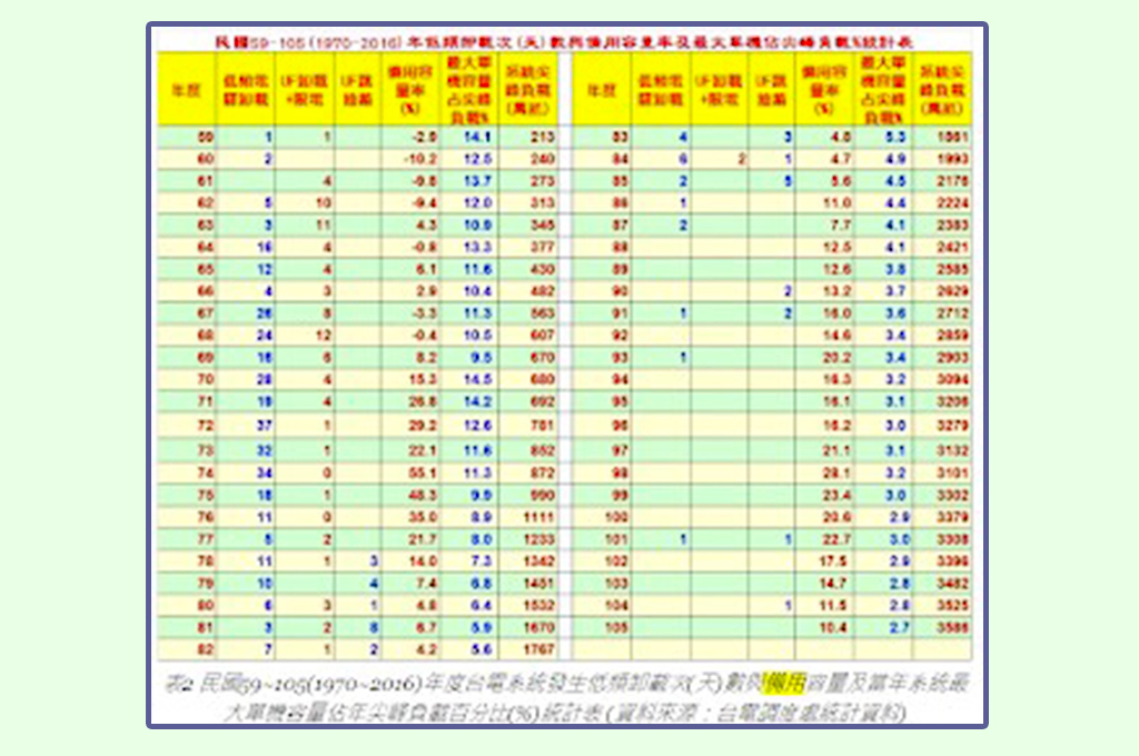 「核能六部機加入系統期間,運轉初期都尚未穩定,經常跳機,從表2可知,民國67~74(1978~1985)年八年期間,雖然備用容量率從-3.3%衝到近30幾年來最高的55.1%,但低頻電驛動作次(天)數高達22~38天,只有兩年22及23次,其餘都是30幾次,限電量又大。」