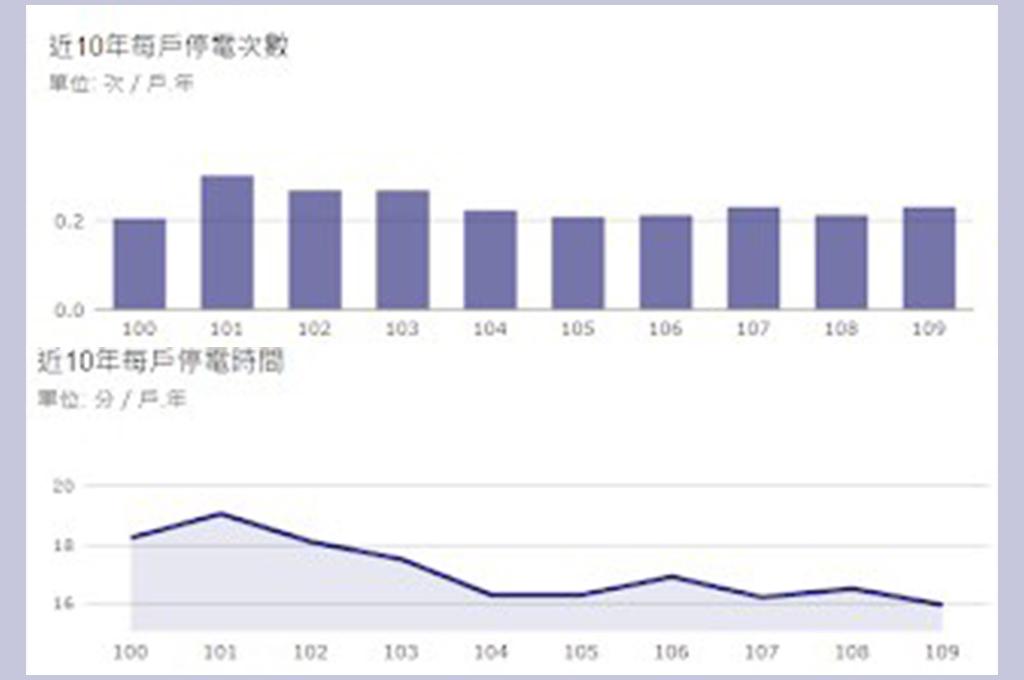 從2011到2020年,台電每年每戶的平均停電次數,幾乎都控制在0.2次左右,換言之,平均一戶要五年才會停電一次;每戶每年的平均停電分鐘,也控制在16分鐘。