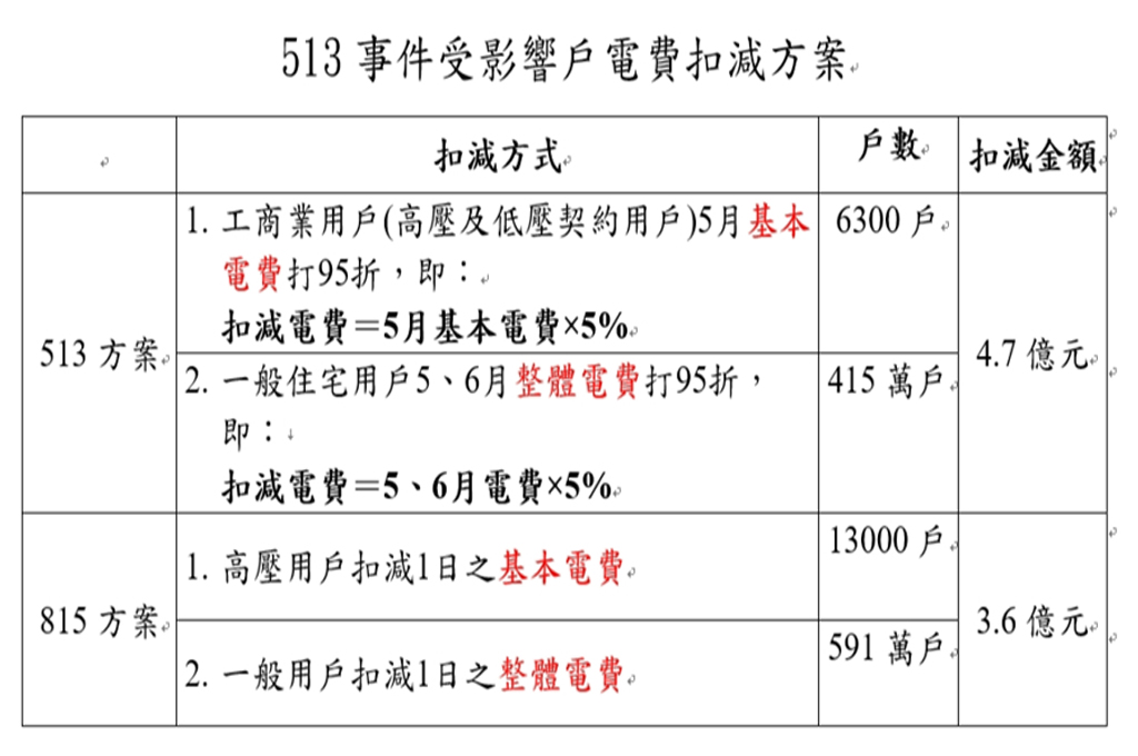 台電發布新聞稿表示,正式研議提出「513停電事故電費扣減專案」,針對受影響的低壓用戶,包含一般民生及小商店用戶,用戶當期所有電費提供5%減免;而高壓的工業用戶,亦提供當月基本電費5%減免,粗估總額約5億元,將直接從下期電費帳單扣減。