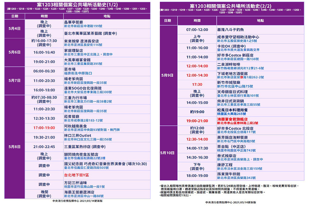 針對新北蘆洲獅子會會長(案1203)相關個案公共場所活動史,陳時中表示,今日新增5月8日新增台北地下街Y區、5月9日鴻喜宴會館旗艦店(地址:新北市泰山區泰林路二段2號)兩個點。