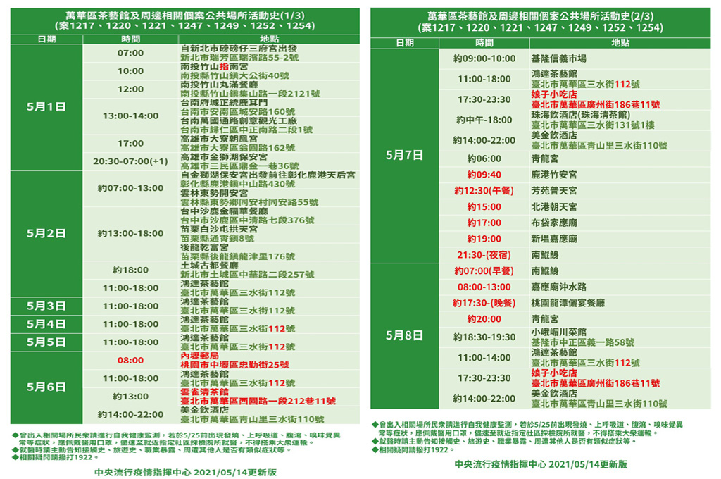 陳時中指出,萬華茶館相關活動史則新增5月6日內壢郵局、雲雀清茶館(地點:台北市萬華區西園路一段212巷11號);5月7日、8日娘子小吃店(地址:台北市萬華區廣州街186巷11號),這幾筆活動足跡。