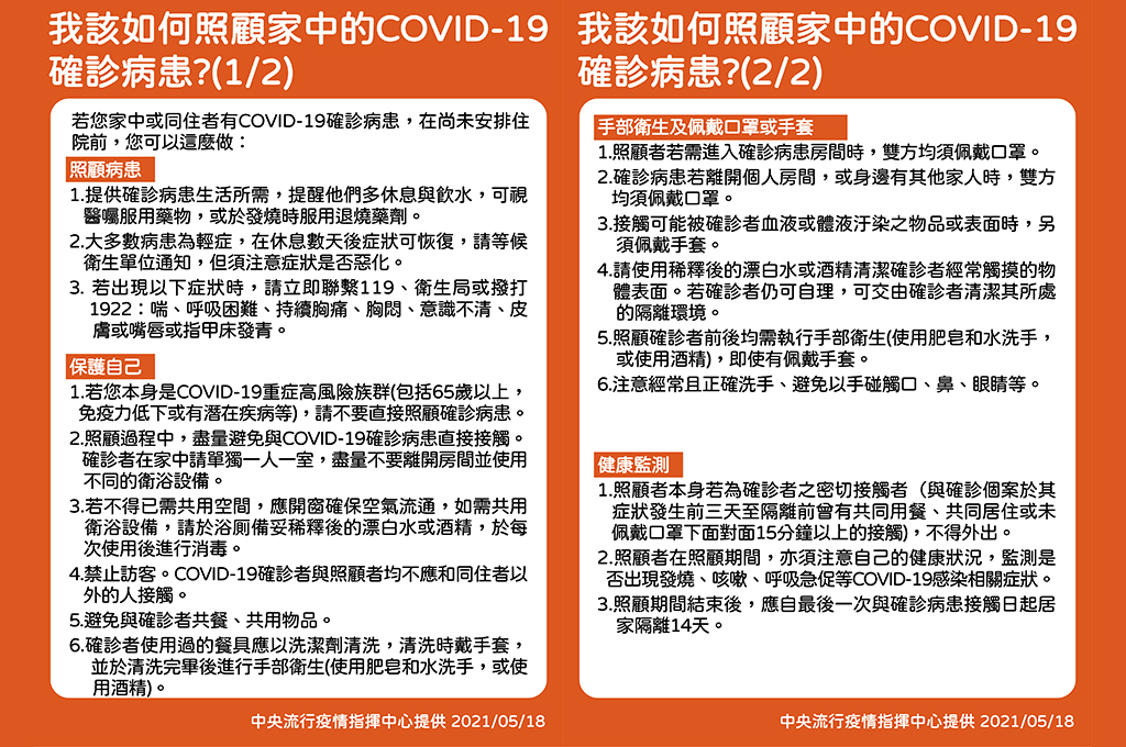 - 大部分的COVID-19感染者症狀輕微,休養後即可自行康復,為了將醫療資源留給重症患者,請先留在家中不要離開,等候公衛人員通知。