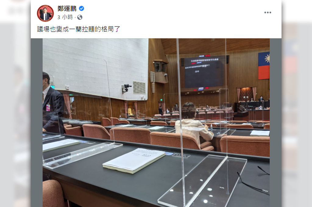 本土疫情尚未減緩,立法院今天舉行院會,除了落實人員全程戴口罩,入場量體溫、消毒,議場內座位也首度加裝「透明隔板」,加強防疫。目前立委羅致政已證實,辦公室有一名助理確診,盡管他本人PCR篩檢陰性,但立法院相關工作人員都不敢大意輕忽。立法院後來採行視訊會議、表決測試,不過稍早已進入會場的鄭運鵬笑稱,「議場也變成一蘭拉麵的格局了!」
