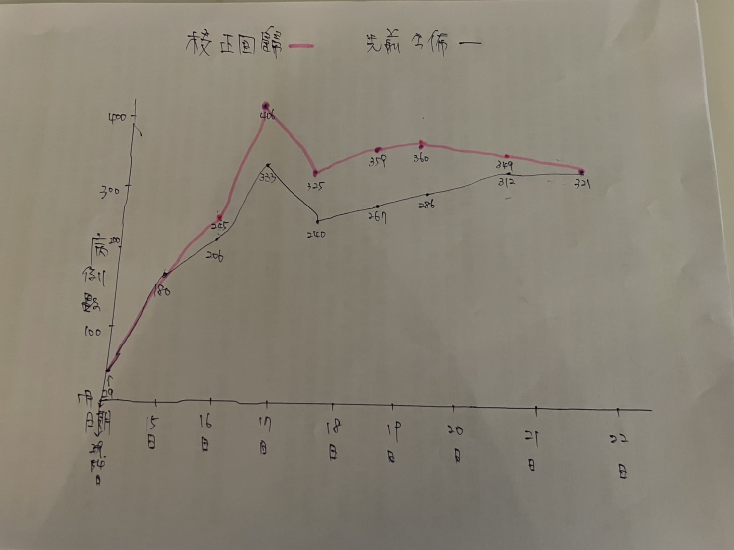 根據指揮中心校正公布,16日原206例,校正後245例;17日原333例,校正後406例;18日原240例,校正後325例;19日原267例,校正後359例;20日原286例,校正後360例;21日原312例、校正後349例。今天22日目前是321例