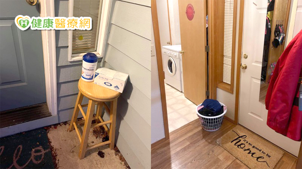 (左)住家門口放置消毒用品與口罩供外送人員使用,(右)住家進門後立刻將全身衣物脫下至洗衣籃清洗。