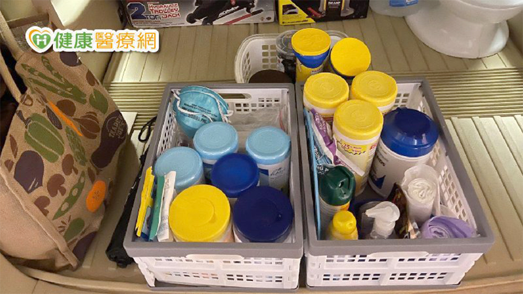 自家車內備妥口罩、手套、酒精等消毒用品、換洗衣物、適量食物跟水。