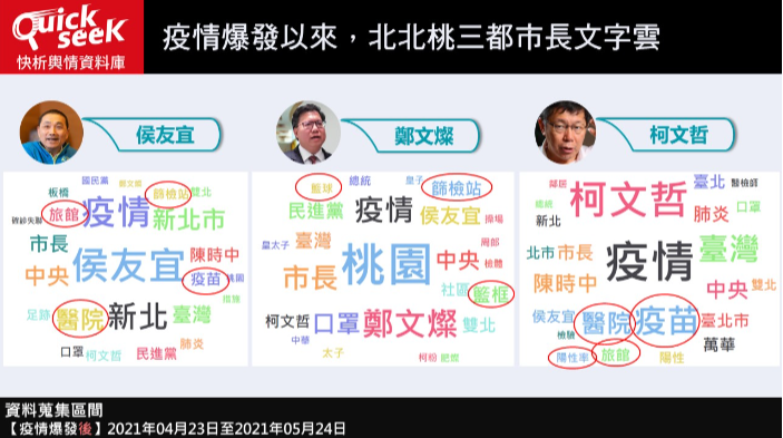 另外,柯文哲的熱字為「疫苗」、「陽性率」、「醫院」和「旅館」,從熱門關鍵字中分析,柯文哲在疫情爆發後,迅速在萬華成立快篩站,升級防疫旅館規格,提升網友的好感度。侯友宜的熱字為「檢疫站」、「旅館」和「醫院」,侯友宜多次因喊話「封城」和「準四級」,引發爭議。至於鄭文燦的熱字為「籃框」、「籃球」及「檢疫站」,由於大動作拆除籃框的指令,引來網友們的譏諷。