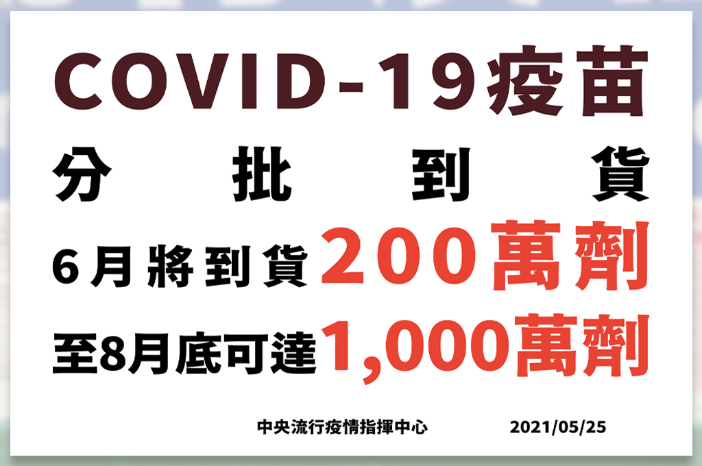 中央流行疫情指揮中心指揮官陳時中今(25)日在記者會上透露,除了上週抵台的41萬劑AZ疫苗將開始分配給地方政府,6月底疫苗將到貨200萬,到了8月底可達1千萬劑疫苗;其中1千萬劑包含「國產疫苗」。至於不透露疫苗品牌的原因,陳時中語帶情緒稱「你問我有什麼顧慮,我顧慮很大,這段時間我們吃的虧還不夠大嗎?」