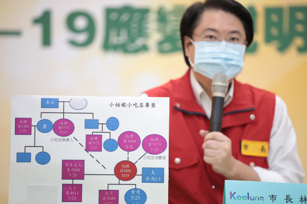 針對小姑娘小吃店女員工(案3835),林右昌說明,個案工作場所出入人多,且感染源不明;她確診後,其兒子(案3686)、男友(案4808)以及男友的兒子(案4811)皆染疫,以及案5772小姑娘小吃店負責人、案5206為案5572家屬、案3910小吃店員工、案5573小吃店消費者也都已經確診,共計9人。