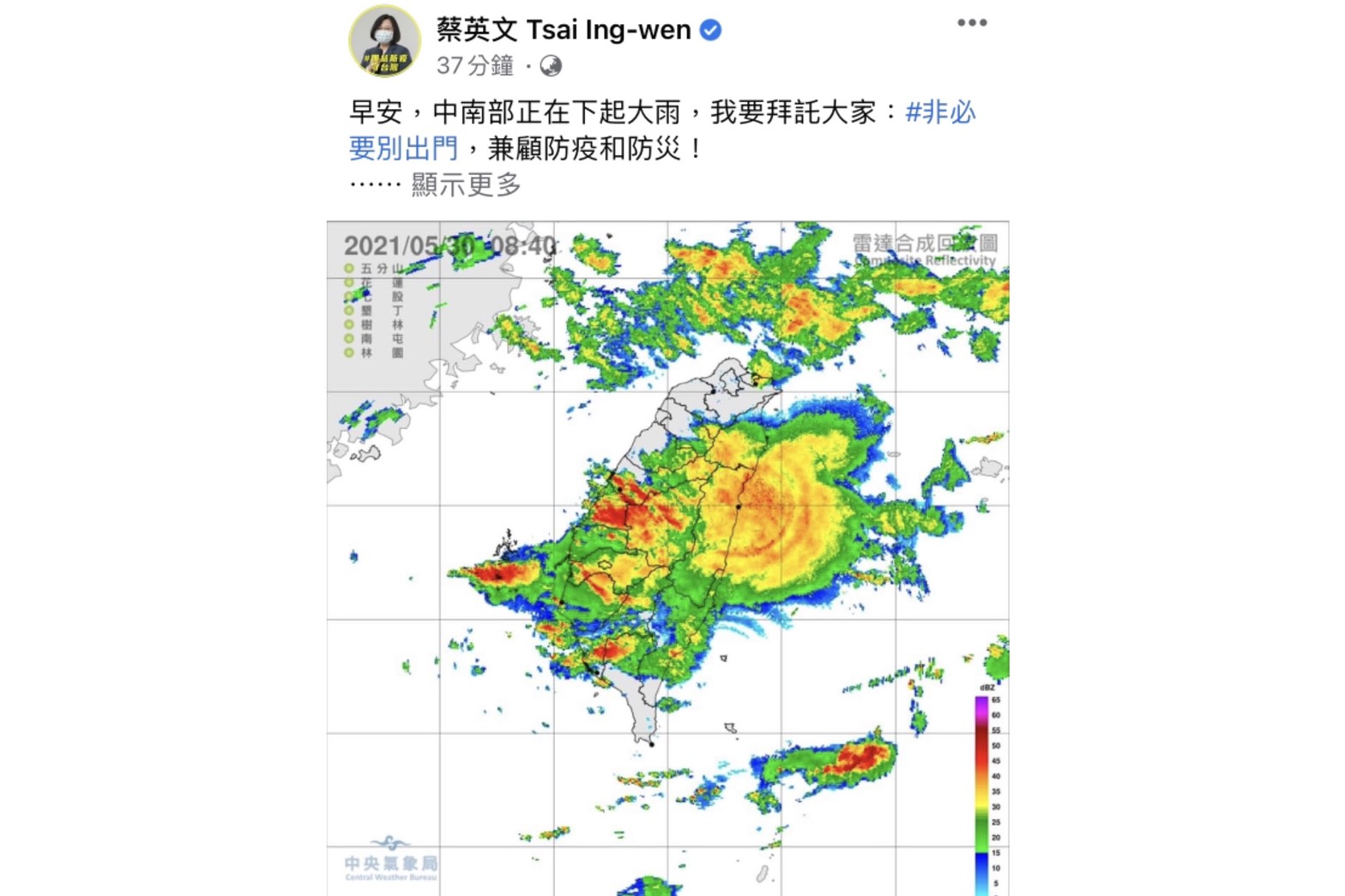 蔡英文提醒中部市民,開心的同時也要小心雷擊、強風、坍方、積水,非必要別出門,防災兼顧防疫!