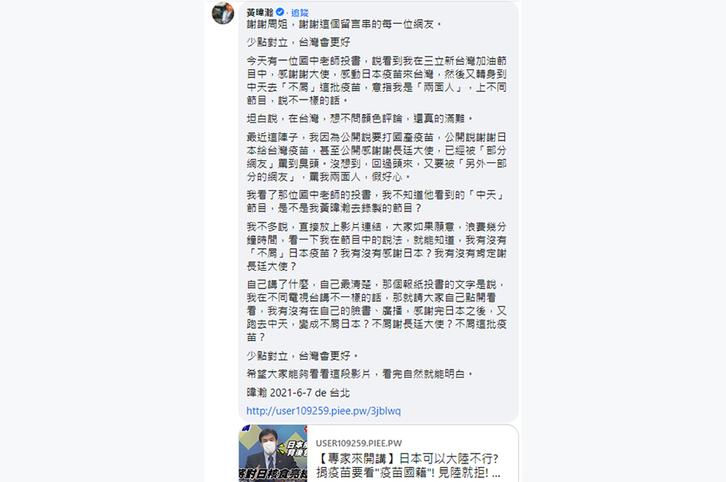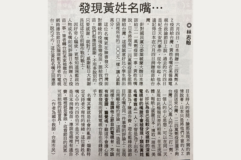 一名讀者、國中教師林志翰投書《自由評論》今(7日)日出刊,他以《發現黃姓名嘴…》為題,提到「黃姓名嘴」在主流媒體、報紙上感謝日本,同一天卻又在深藍電視台稱是日本不要的AZ疫苗、劑量不夠;質疑「黃姓名嘴」枱面上一套、枱面下一套,玩兩面手法,人品有問題。資深媒體人周玉蔻在臉書評論此事,遭黃策動網友檢舉下架,黃本人卻主動Line致意,讓她直言「這就是兩面手法」。