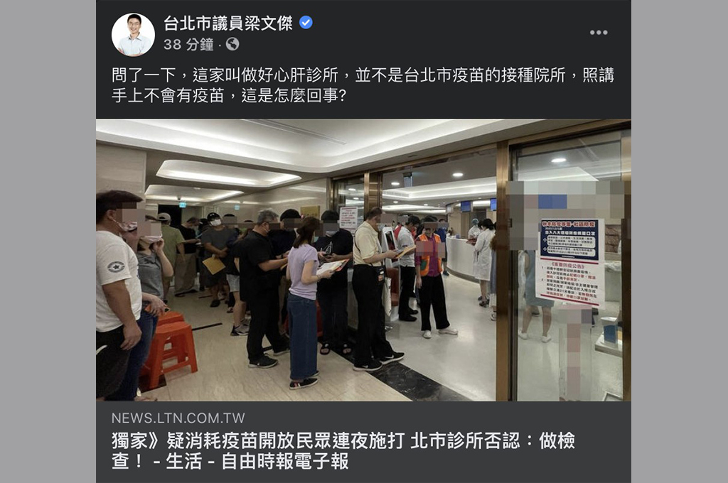 北市府疑似為了消耗疫苗,昨(8)日傍晚竟臨時開放一般民眾免費接種,直到晚間10點仍有民眾在現場等待。這間診所醫護不僅面對媒體矢口否認,謊稱現場排隊民眾是「在做別的檢查」,台北市議員梁文傑今(9)日踢爆,這家叫做「好心肝診所」,並非北市疫苖接種院所,照理講手上不會有疫苖。追查相關資料顯示,好心肝診所基金會董事長許金川,就是台北市長柯文哲的恩師!