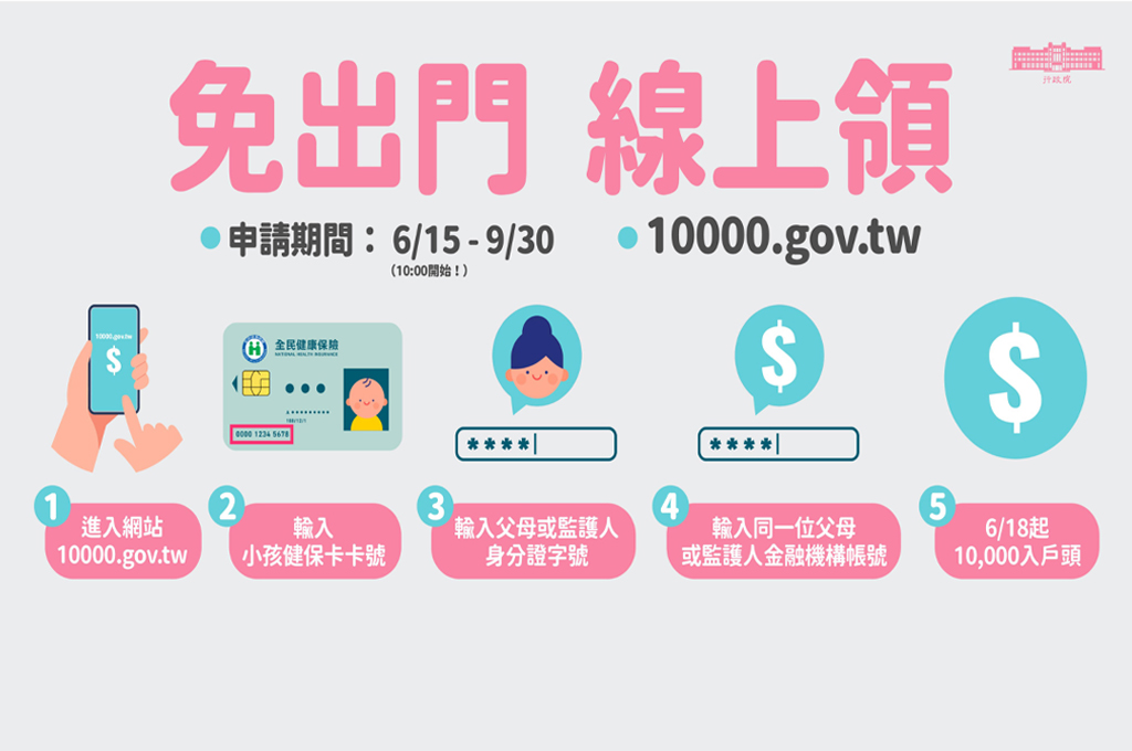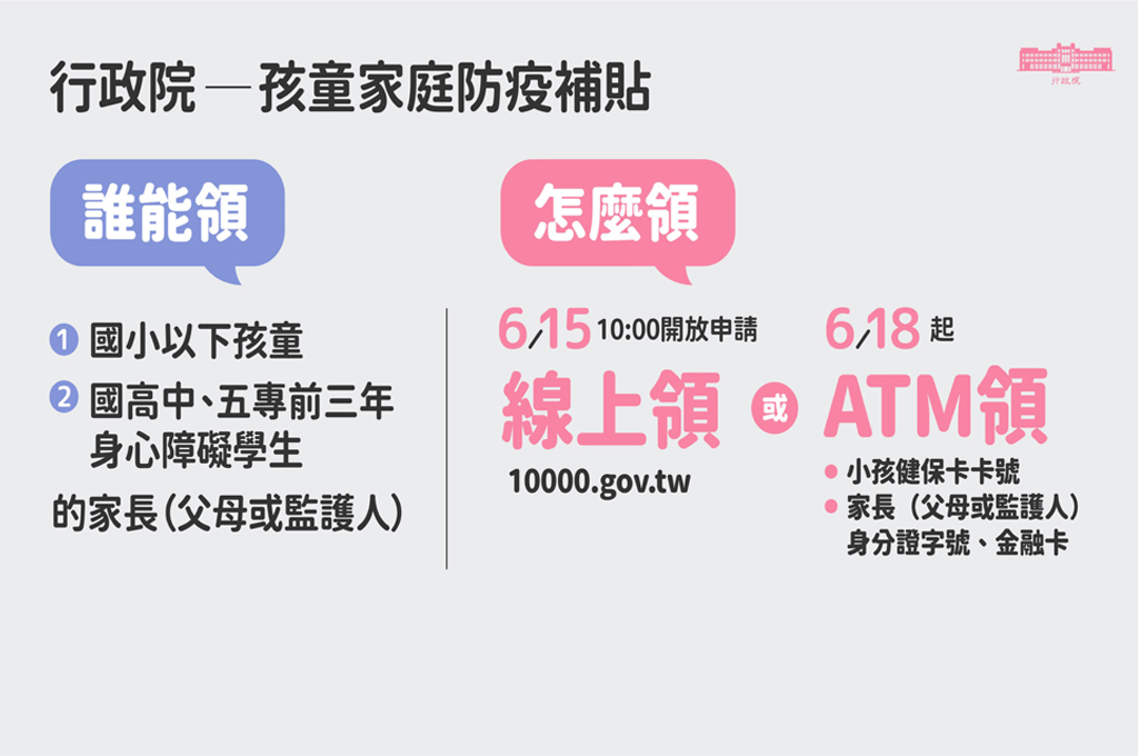 5日開放日當天,會開放特別建置的專屬網站,家長可透過網站提領;18日開放線上查詢相關資料入帳訊息,並於18日進行ATM領款,台新銀行、中國信託、國泰世銀都可領取。