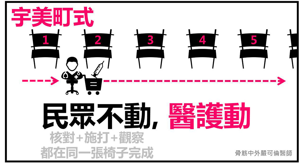 嚴可倫表示,宇美町式注射法的精神就是「民眾不動、醫護動」。場地依照社交距離擺放標記號碼的椅子,民眾只需要找到自己的號碼坐下,不再需要跑好幾站,單純許多。等待醫護坐著滑輪椅、推著工具車、依序確認身分、核對病史並完成打針。打完就坐在原地觀察,當民眾起身離開時,整個施打程序就完成了,單純又有極高效率。