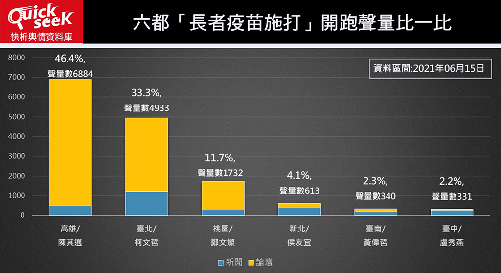 「QuickseeK快析輿情資料庫」分析,比較六都長者疫苗施打首日的聲量,「高雄」與「陳其邁」以6884筆,46.4%奪冠,其次是「台北」與「柯文哲」33.3%、「桃園」與「鄭文燦」11.7%、「新北」與「侯友宜」4.1%、「台南」與「黃偉哲」2.3%、「台中」與「盧秀燕」2.2%。