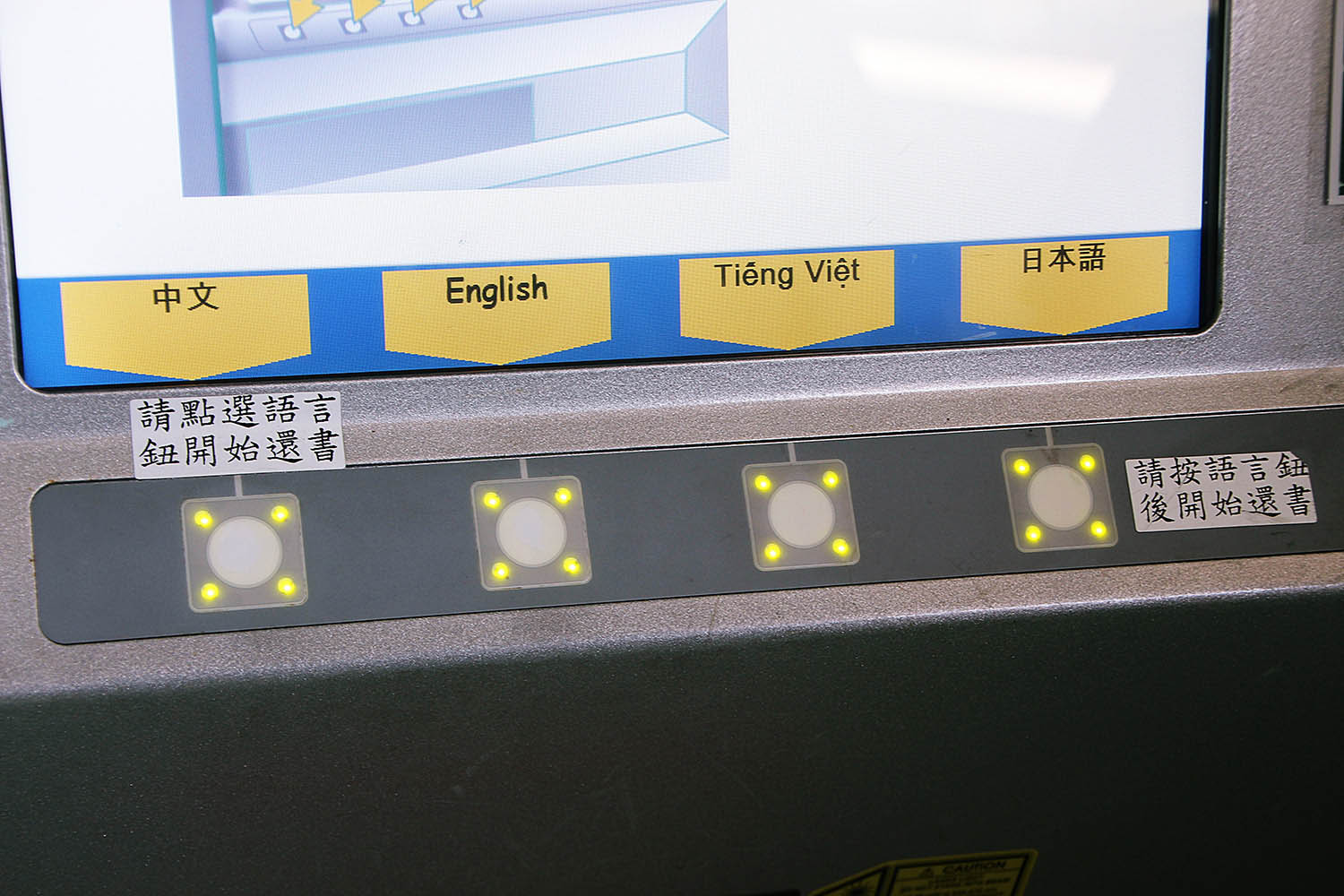 自動還書機操作介面不僅簡單、方便,多種語言選擇更是其亮點,有鑑於越南是繼中國大陸新住民以外,第二多在高雄活動的新住民,為方便越南籍新住民也能使用館內資源,故將越南語納入指引介面中的第四種語言。