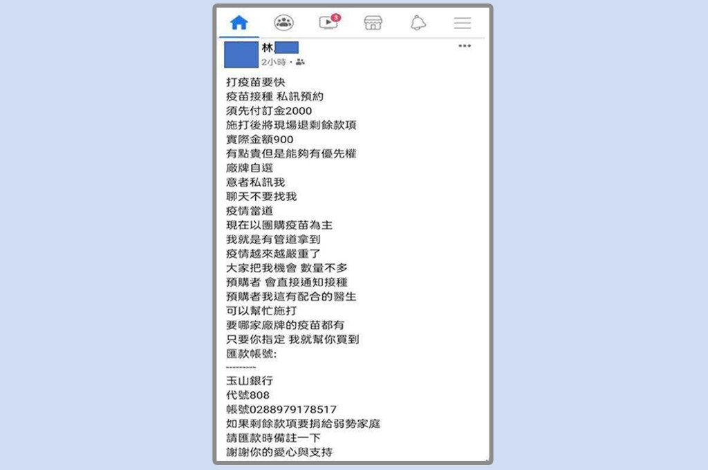 檢警調查,陳嫌自稱是攝影師,用假帳號在臉書貼文稱「打疫苗要快,我就是有管道拿得到」,誇口稱各品牌疫苗他都有,「廠牌自選,只要你指定,我就幫你買到」。