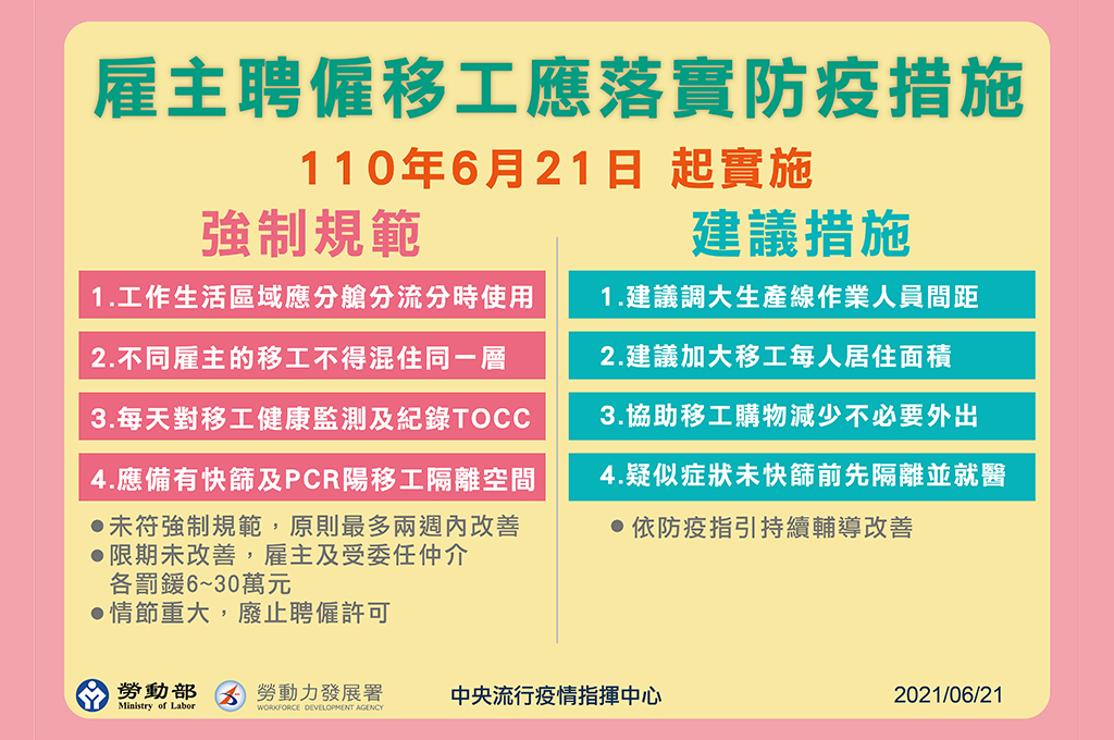 勞動部長許銘春今(21)日在中央流行疫情指揮中心記者會上表示,為促使聘有移工的雇主加強落實防疫工作,勞動部已修訂「因應嚴重特殊傳染性肺炎雇主聘僱移工指引:移工工作、生活及外出管理注意事項」。她說,移工工作及生活區應分艙分流,雇主也應該調整產業人員間距,以確保維持社交距離;若未依照規範處新臺幣6萬至30萬元罰鍰,情節重大者,可再針對聘僱移工名額予以廢止或不予許可