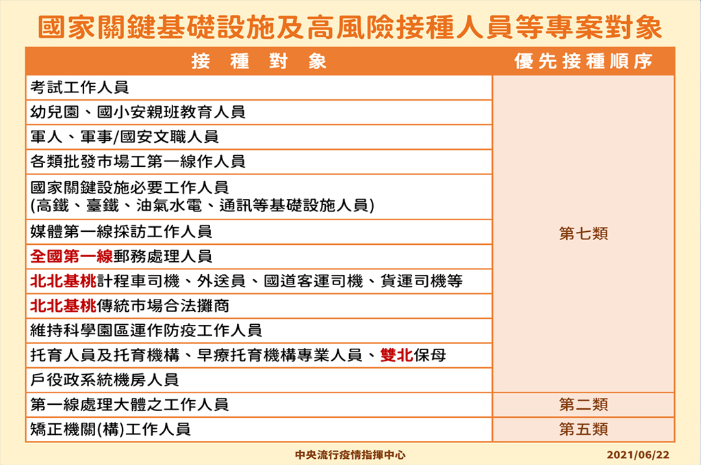 指揮中心指出,依據現階段國內外疫情及疫苗供貨情形,目前開放實施對象包括第一類至第三類、第五類之「住宿型長照機構住民及其照護者」、「洗腎患者」及第六類「75歲以上長者」及「孕婦」。