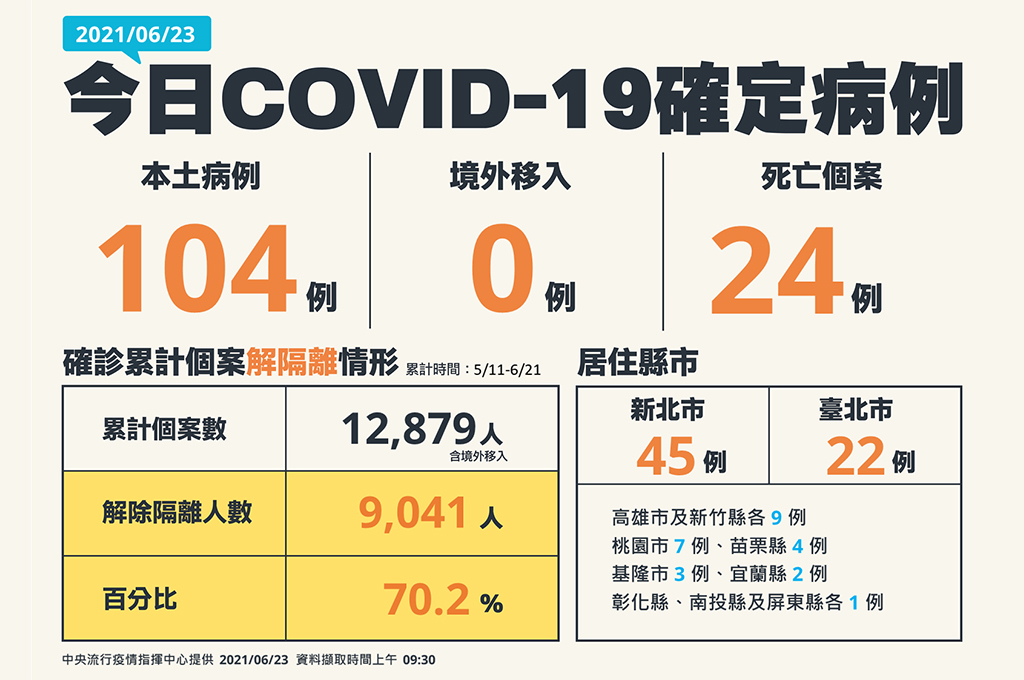 指揮中心表示,今日新增之104例本土病例,為45例男性、59例女性,年齡介於未滿5歲至80多歲,發病日介於今(2021)年6月10日至6月22日。個案分佈以新北市45例最多,其次為臺北市22例,高雄市及新竹縣各9例,桃園市7例,苗栗縣4例,基隆市3例,宜蘭縣2例,彰化縣、南投縣及屏東縣各1例。其中雙北地區以外縣市37例中,28例為已知感染源,5例關聯不明,4例疫調中;相關疫情調查持續進行中。