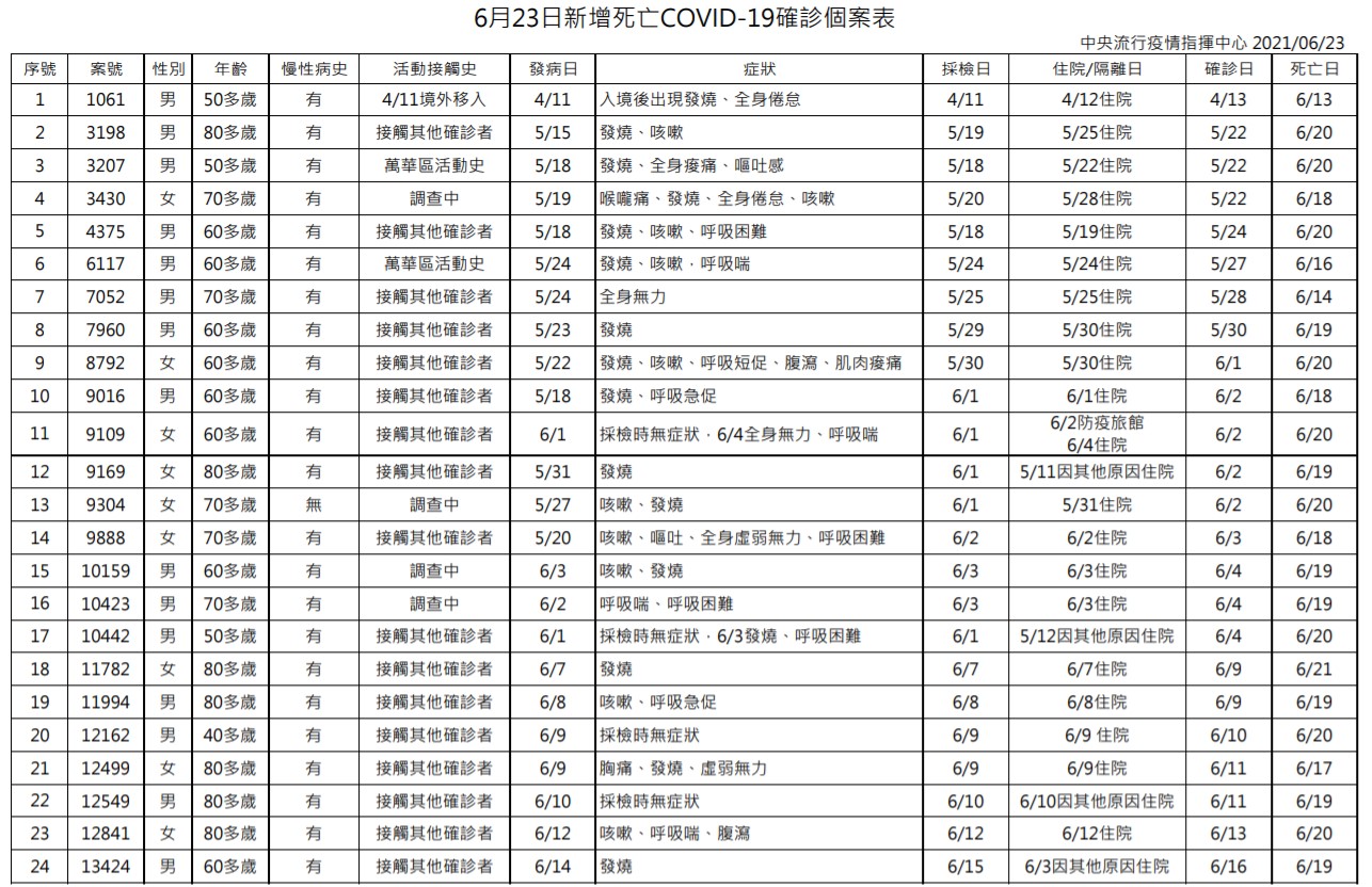 指揮中心說明,今日新增24例死亡個案,為男性15位、女性9位,年齡介於40多歲至80多歲,發病日介於4月11日至6月14日,確診日介於4月13日至6月16日,死亡日介於6月13日至6月21日,詳如新聞稿附件。