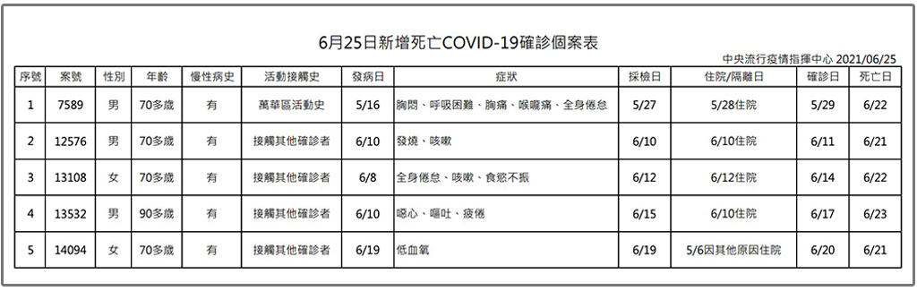 陳時中說明,今日新增5例死亡個案,為3例男性、2例女性,年齡介於70多歲至90多歲,發病日介於5月16日至6月19日,確診日介於5月29日至6月20日,死亡日介於6月21日至6月23日,詳如新聞稿附件。