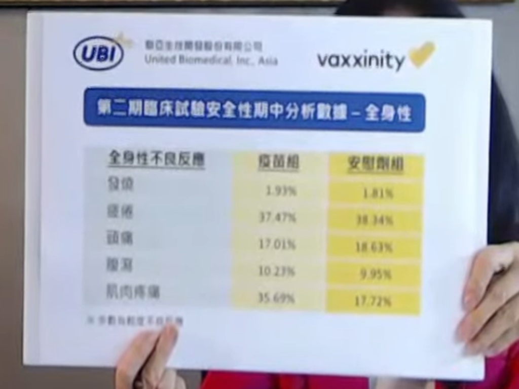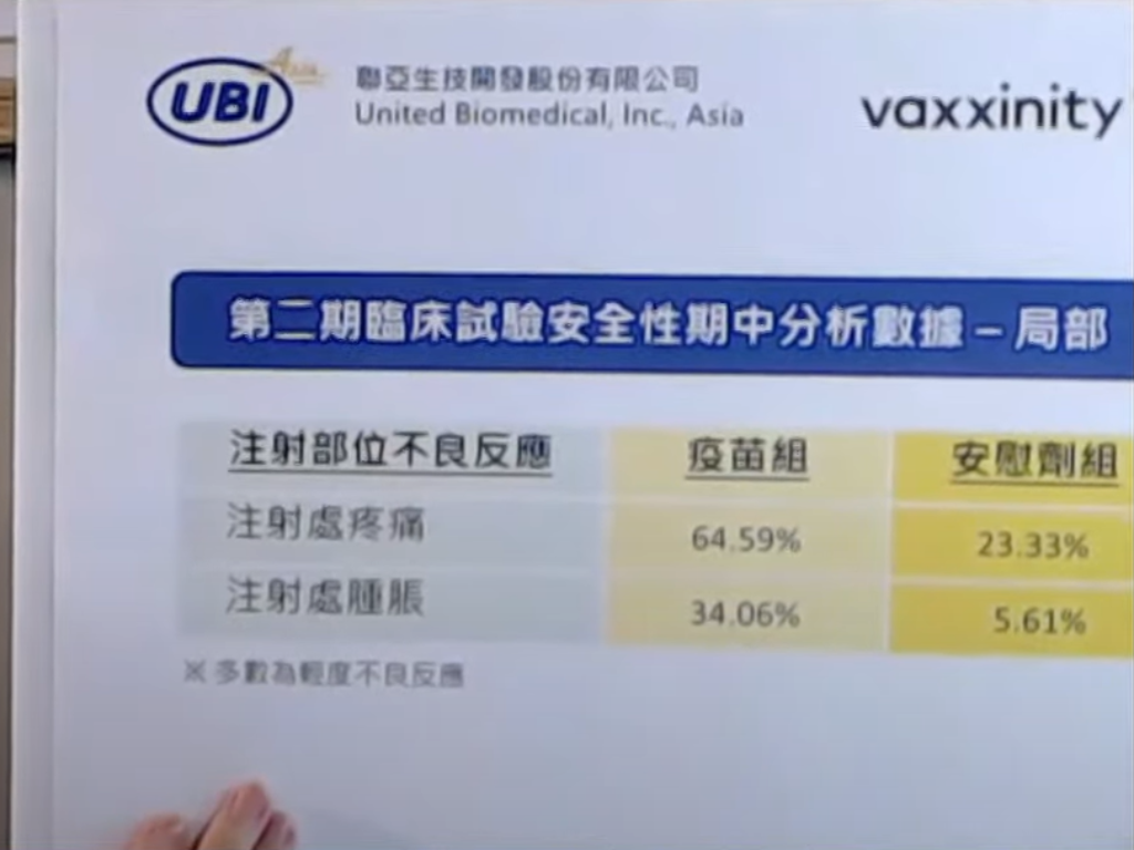 據二期試驗期中分析數據顯示,疫苗安全性、耐受性良好,所有受試者未出現與疫苗相關不良反應。據報告內容顯示,注射處疼痛:疫苗組64.59%、安慰劑組23.33%;注射處腫脹:疫苗組34.06%、安慰劑組5.61%。至於全身症狀部分,發燒:疫苗組1.93%、安慰劑組1.81%;疲倦:疫苗組37.47%、安慰劑組38.34%;頭痛:疫苗組17.01%、安慰劑組18.63%;腹瀉:疫苗組10.23%、安慰劑組9.95%;頭痛:疫苗組35.69%、安慰劑組17.72%。