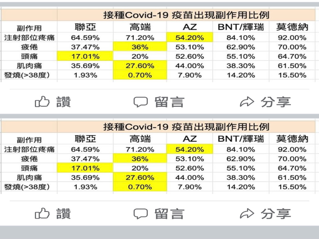 至於全身症狀部分,發燒:疫苗組1.93%、安慰劑組1.81%;疲倦:疫苗組37.47%、安慰劑組38.34%;頭痛:疫苗組17.01%、安慰劑組18.63%;腹瀉:疫苗組10.23%、安慰劑組9.95%;肌肉疼痛:疫苗組35.69%、安慰劑組17.72%。