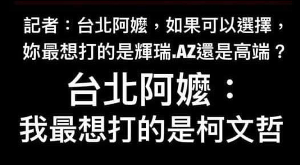 台灣現有莫德納和AZ兩種疫苗,在前一波開放高齡長輩施打期間,「想打哪個廠牌」成為長輩茶餘飯後的話題。一則軼聞寫道,有媒體詢問居住地在台北的阿嬤,最想打莫德納、AZ還是國產疫苗,台北阿嬤妙回:「我最想打的是柯文哲!」網友紛紛稱讚「連阿嬤都超有智慧」、「很寫實的回答」。