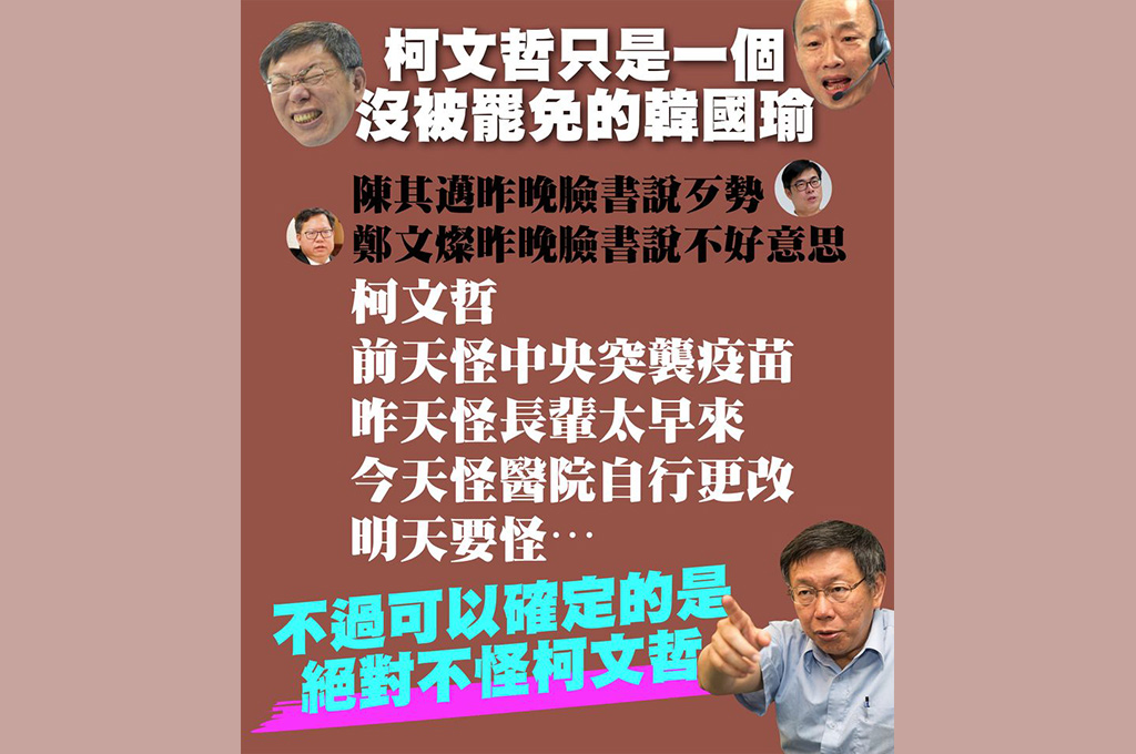 柯文哲因此成為「沒被罷免的韓國瑜」。網友將柯文哲和前高雄市長韓國瑜相比,兩人除了在政治領域都「騙很大」,也很會推卸責任。輿論嘲諷,柯文哲前天怪中央突襲疫苗、昨天怪長輩太早來、今天怪醫院自行更改行程、明天要怪⋯?不過可以確定的是,「柯文哲絕對不怪自己」。