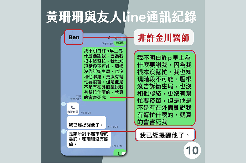 就是許金川這句「謝謝珊珊副市長」,讓外界認為是黃珊珊下達指令,要衛生局提供疫苗給好心肝診所施打。不過,黃珊珊矢口否認,她說自己6月1日至8日期間身體不適,白天雖然有進市府工作,但晚上都在仁愛醫院「吊點滴」,根本沒有讀到友人的訊息,「還搞不清楚狀況」、「不知道有這件事情」。直到6月9日看到新聞爆出,北市某診所漏夜偷打疫苗,她才趕緊詢問Ben「好像是好心肝?」並請他提供許金川的聯絡方式讓兩人直接聯繫。她也和Ben說,不明白許金川為何要感謝她,她根本沒幫忙要疫苗,「但他(許)是不是有在外面亂說我有幫忙什麼的,就真的會害死我」。