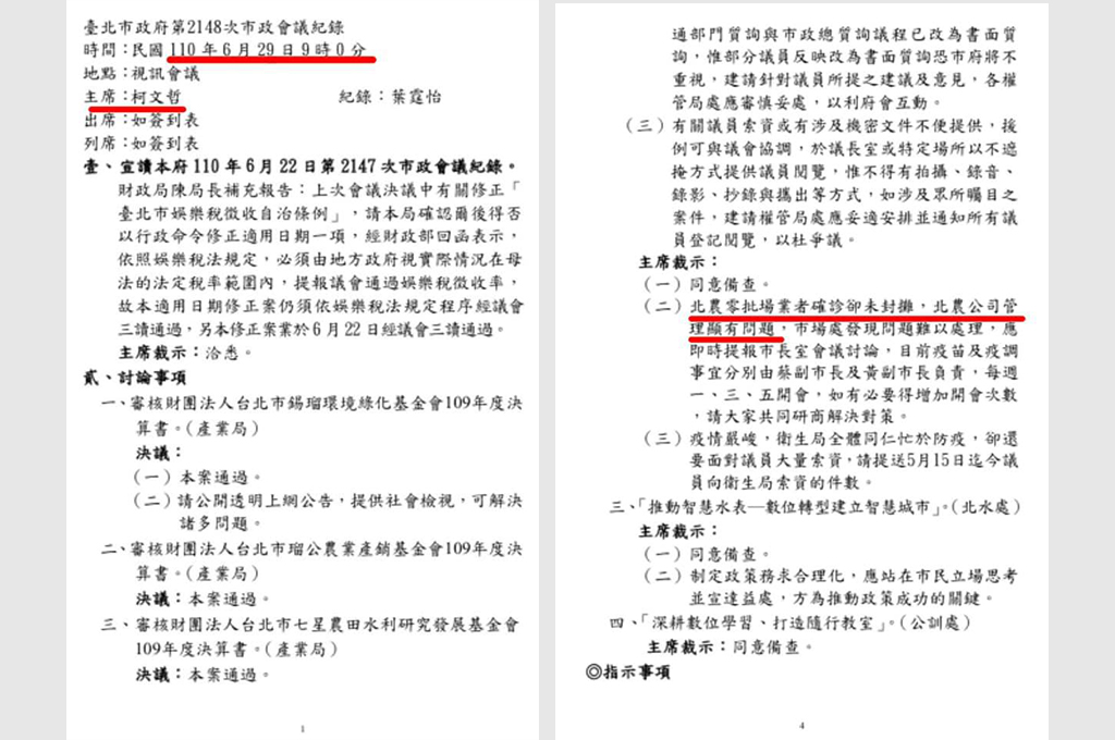 陳怡君在臉書表示,柯文哲於6月29日的市政會議上坦承,「北農零批業者確診卻未封攤,北農公司管理顯有問題,市場處發現問題難以處理,應即時提報市長室會議討論。」
