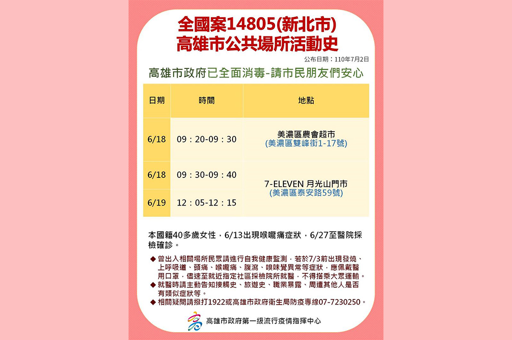 足跡方面,衛生局指出,該女在6月18日早上9點20到9點30分間出入美濃區農會超市,6月18日9點30分到9點40分、以及6月19日12點05分到12點15分曾出入統一超商月光山門市,若民眾出現不適狀況一定要聯絡1922聯絡安排採檢。