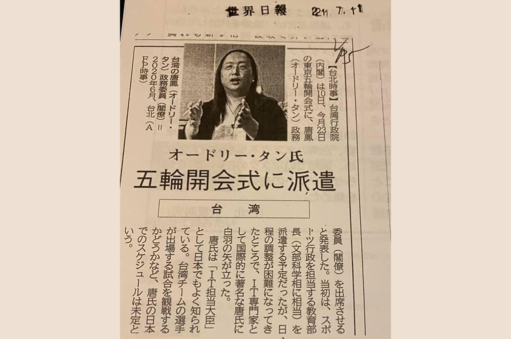行政院10日公告由數位政委,也是日本盛讚的「天才IT大臣」唐鳳代表我國出席東京奧運。唐鳳挾帶的高人氣不容小覷,我國駐日代表謝長廷便分享許多日媒報導照片,證實所言不假,更有許多人想與唐鳳交流,可惜東京處於緊急事態期間,許多邀約可能無法成行。日本網友也熱情表示歡迎,並期盼唐鳳能協助改善日本的疫苗預約系統。
