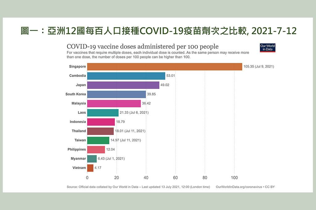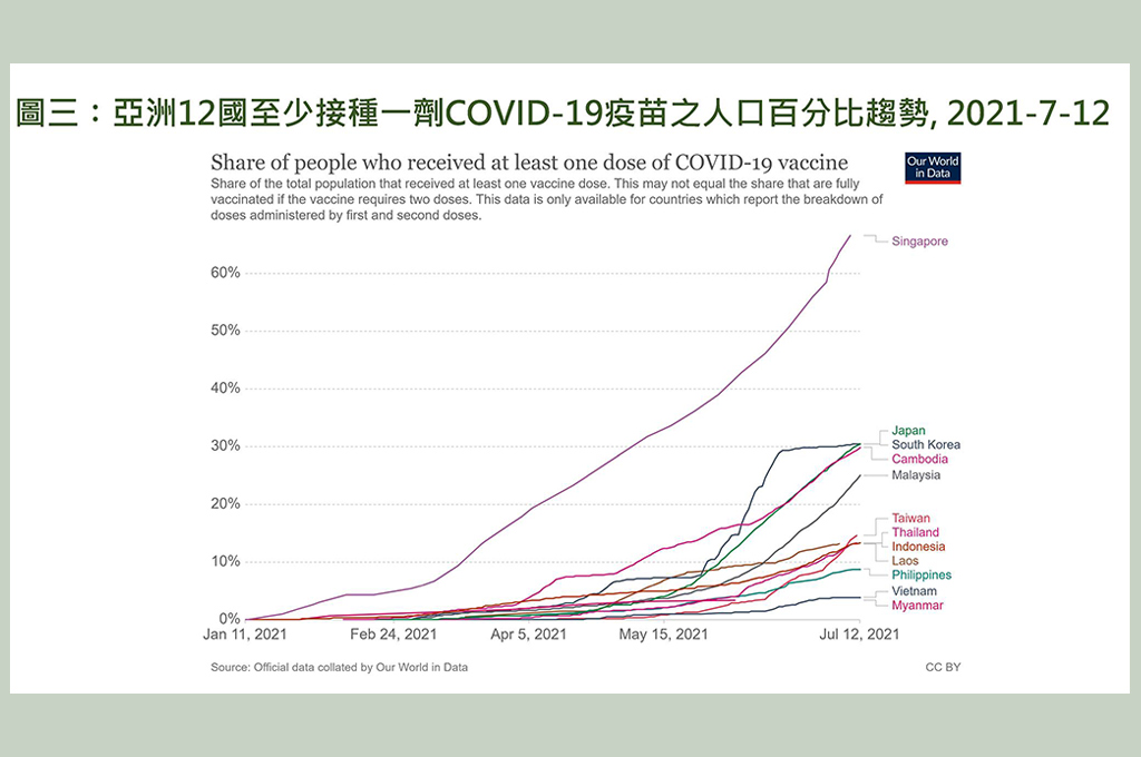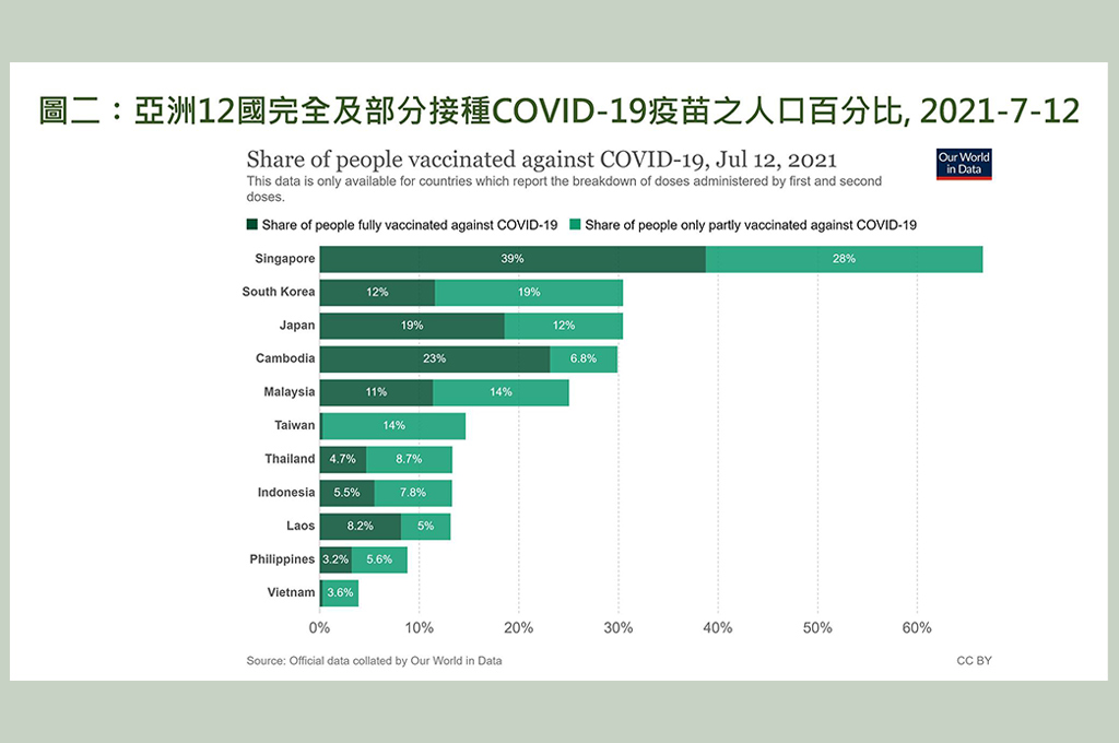 再者,各國完全(兩劑)和部分(一劑)接種疫苗的人口百分比中,新加坡有39%完全接種,28%部分接種;南韓有12%完全接種,19%部分接種;柬埔寨有23%完全接種,7%部分接種;台灣只有0.3%完全接種,卻有14.4%部分接種;越南只有0.3%完全接種,3.6%部分接種。