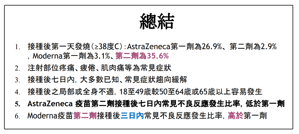 另根據指揮中心日前統計,接種AZ第一劑,注射部位疼痛最多達55%,再來是疲倦肌肉痛,發燒則占26.9%;相對地,接種莫德納第一劑發燒僅3.1%。另不論廠牌,接種後7日內,副作用症狀趨向緩解,且18至49歲的年齡層發生副作用的機率高於50歲以上。