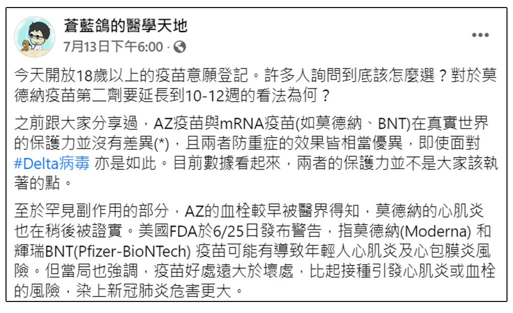 另根據國外研究顯示、台大醫院兒科醫師蒼藍鴿分享,30歲以下的男性在接種mRNA疫苗後,較容易發生心肌炎或心包膜炎等狀況,若接種第二劑機率達百萬分之16。不過,美國食品藥物管理局(FDA)仍對此強調,接種疫苗還是利大於弊。