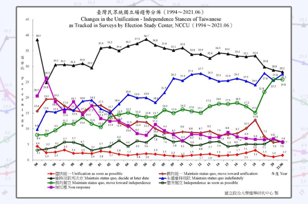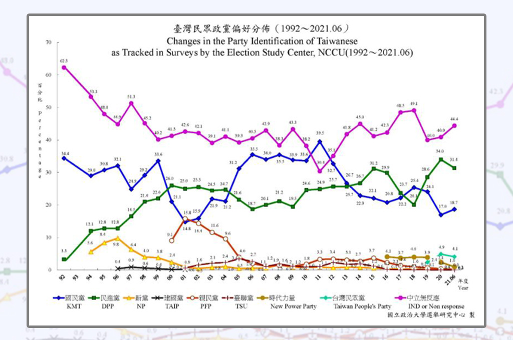 7月20日,政大選舉研究中心公佈了最新一期的台灣政治態度趨勢。這份電訪研究從1992年至今做了29年,每年電訪樣本數約有一兩萬人,今年做到6月,樣本數4717人,在眾多民調中有重要參考價值,可信度遠高於台灣民意基金會的民調。