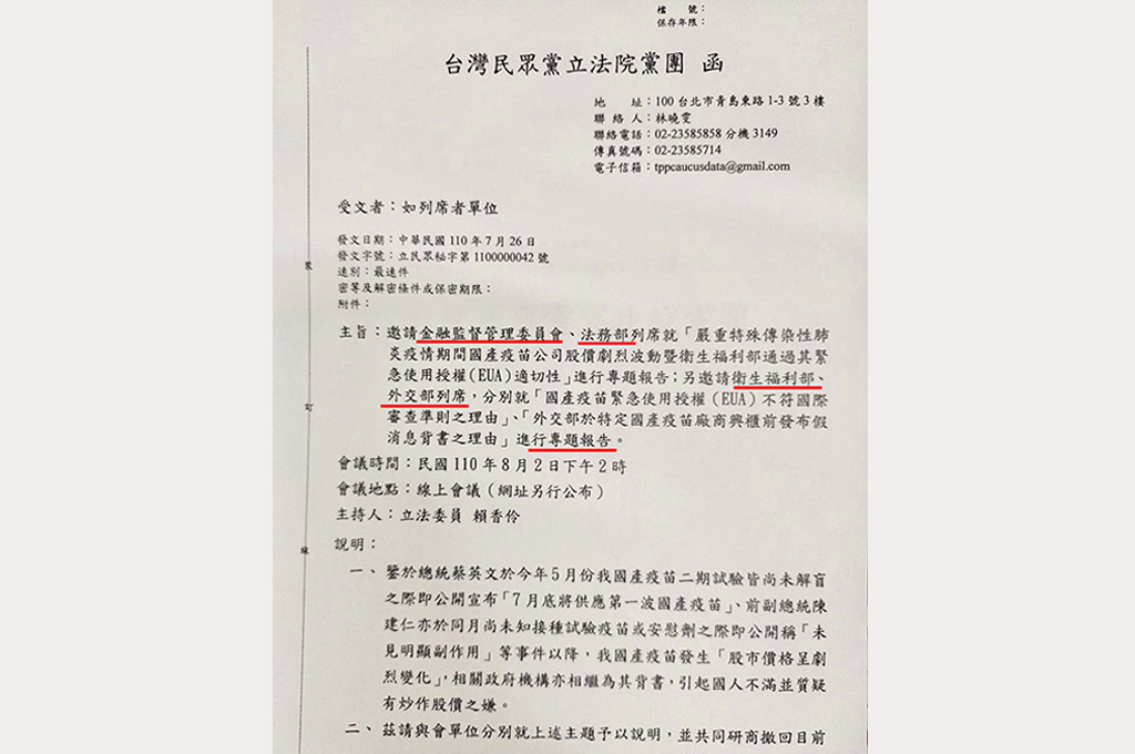 民眾黨團發文主旨為,邀請金管會、法務部就國產疫苗股價劇烈波動,且衛福部通過緊急使用授權(EUA)的適切性;以及衛福部就國產疫苗不符國際審查準則、外交部在國產疫苗興櫃前發布假消息背書,提出專題報告。