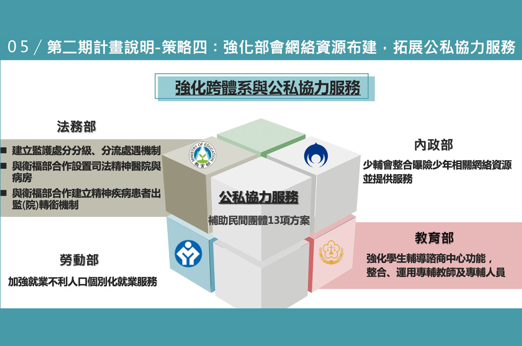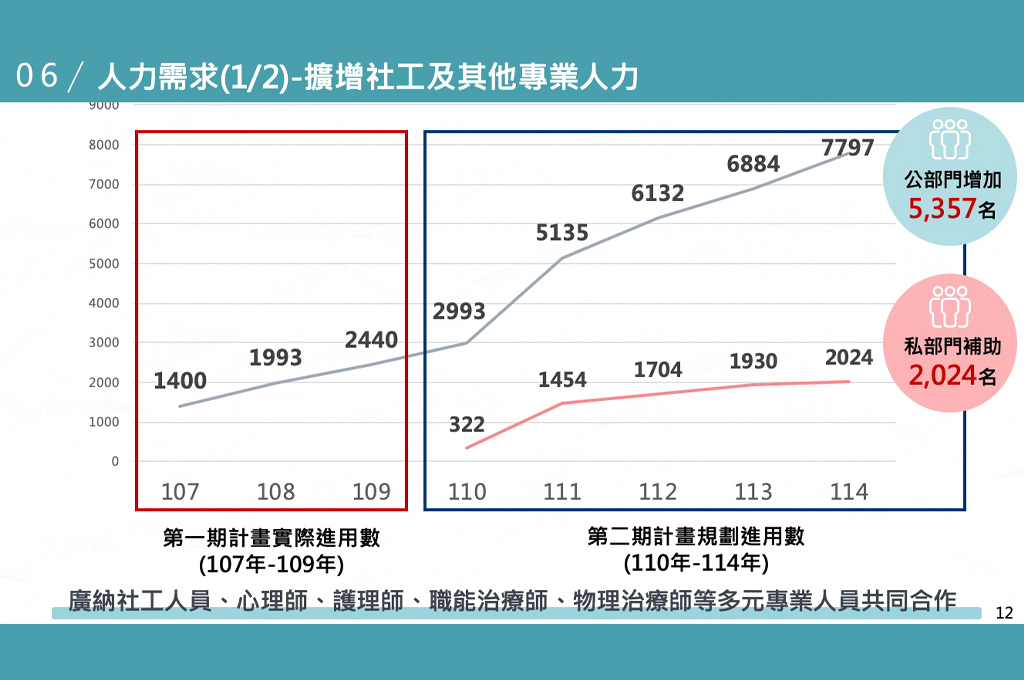 在人力部分,衛福部次長李麗芬補充,除了社福中心的社工人力外,第二期還新增自殺、精神疾病關訪員、毒防中心的人員也都納入擴增範圍,把整體對象擴大後來新增需要的能力,另外還包括心理師、護理師、職能師、物理治療師等,對於家庭個人服務需要的專業人力。她強調,整個人力配置並不只是要達到「倍增」的政策目標,而是回到真正的需求,來統計各項服務所需要的專業人力。